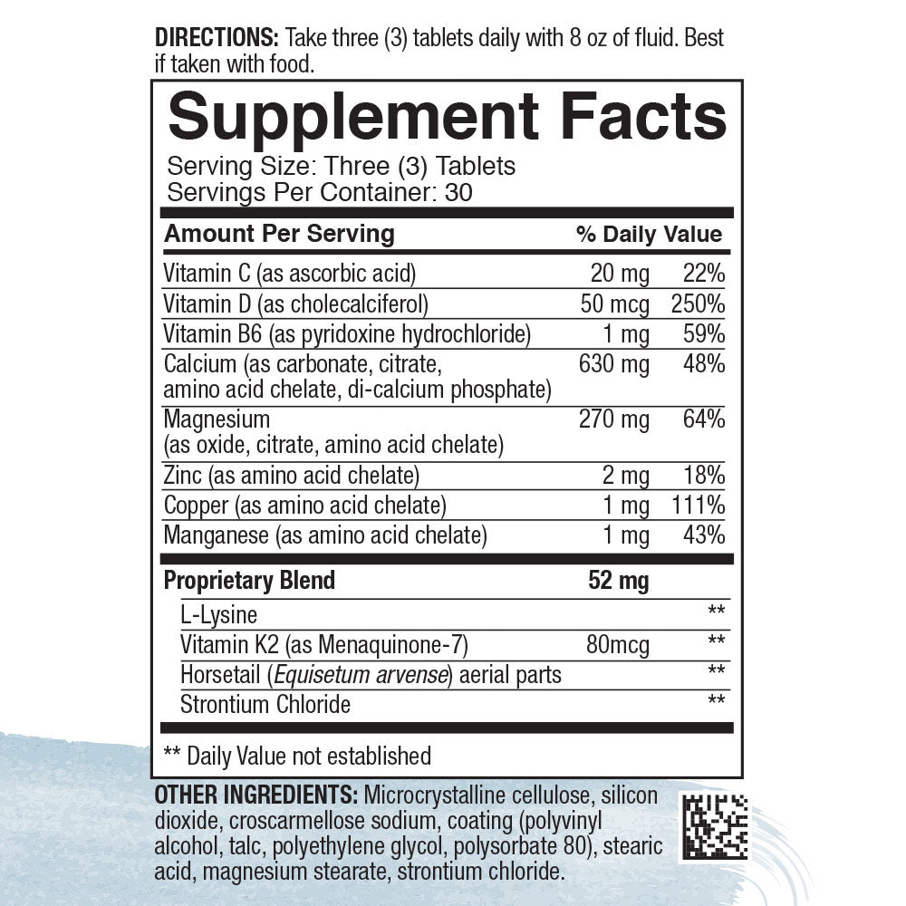 Vitamin C, Vitamin D, Vitamin K, Vitamin B6, Calcium, Magnesium, Zinc, Copper, Manganese, L-Lysine, Soy Lecithin, Horsetail, Boron, and Strontium.