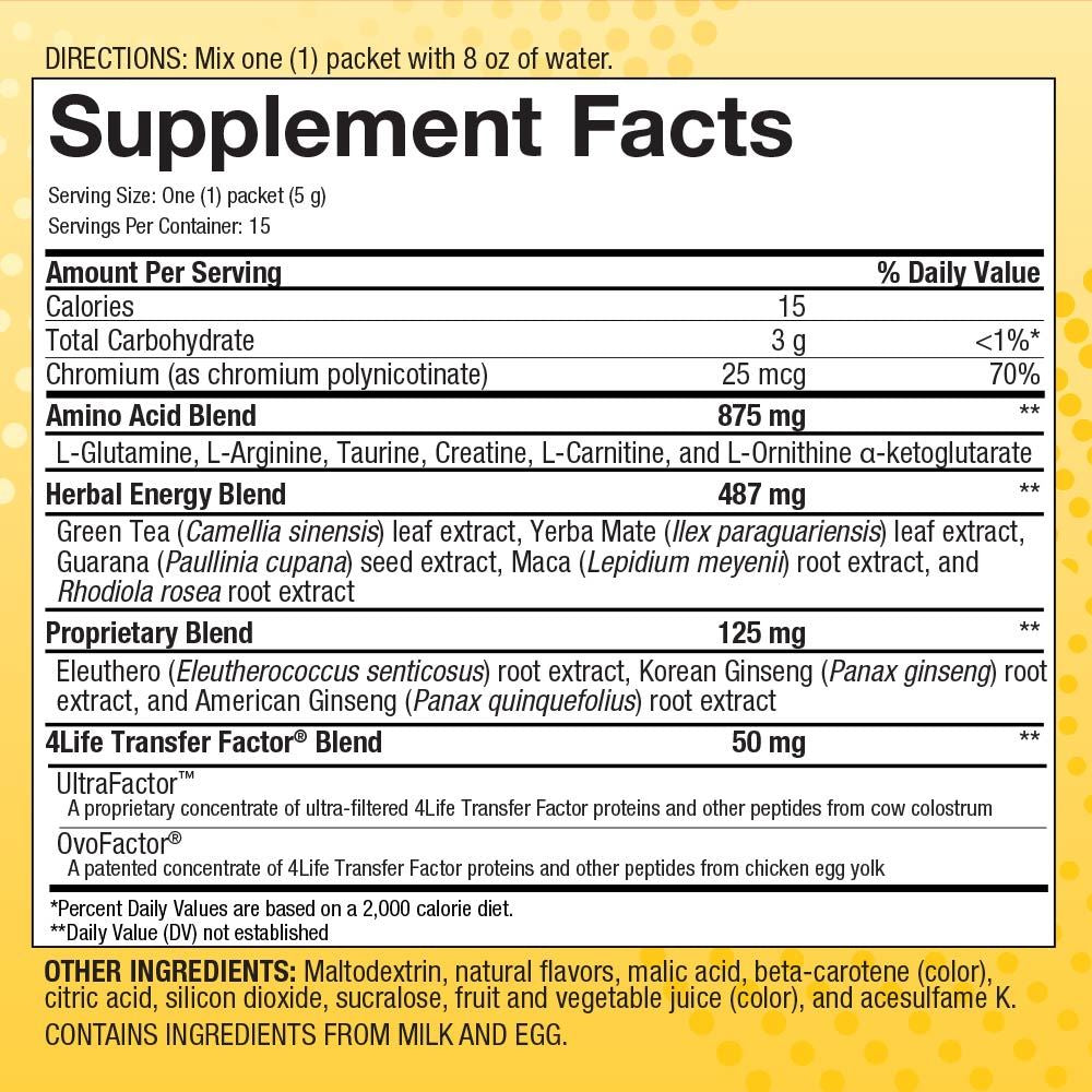 Energy supplement in ready-to-mix powder packs that combines pineapple, passion fruit, and mango flavors